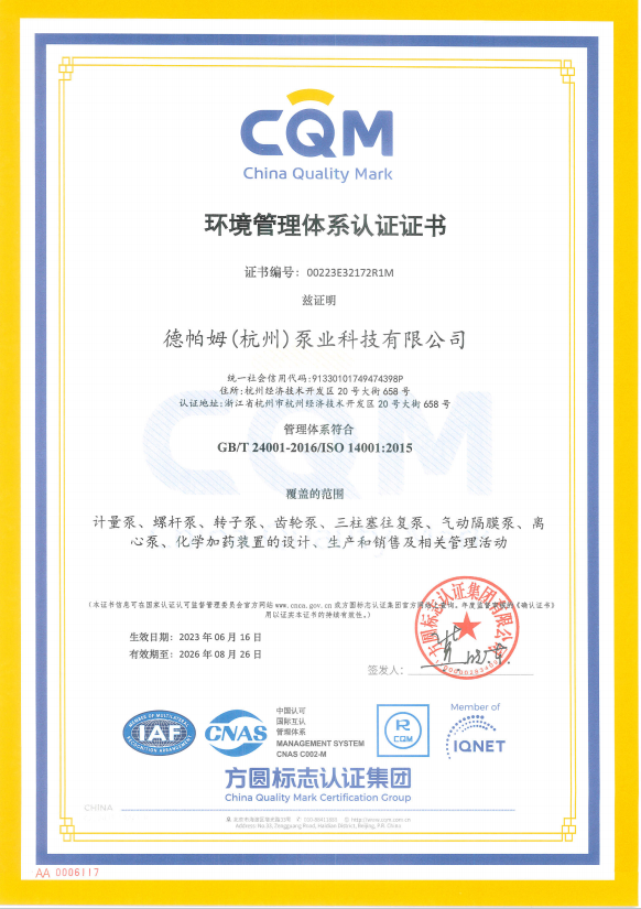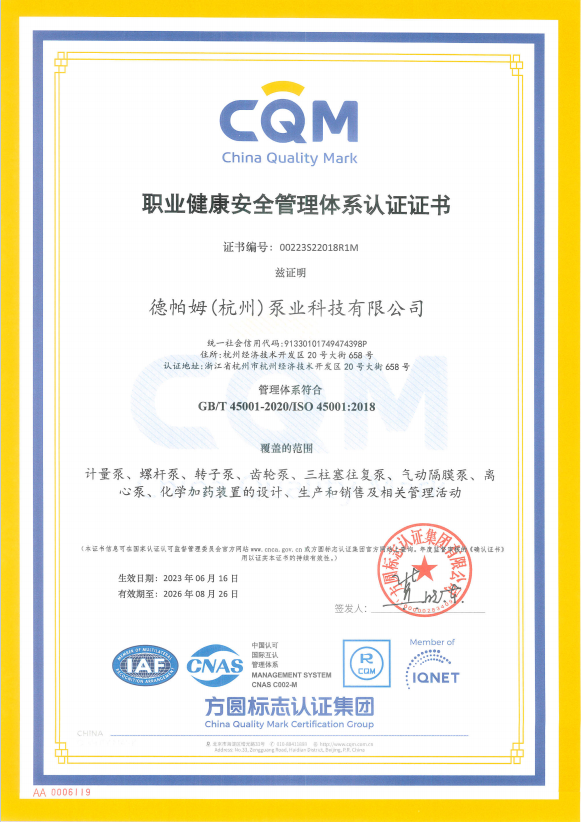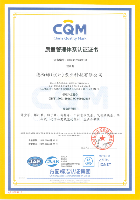 德帕姆(杭州)泵業(yè)科技有限公司地處國家級經(jīng)濟技術(shù)開發(fā)區(qū)所在地——杭州錢塘區(qū),成立于2003年,是一家集研發(fā)、生產(chǎn)、銷售于一體的高新技術(shù)企業(yè)。主要產(chǎn)品有計量泵(柱塞/機械/液壓)、高壓過程往復泵(柱塞/隔膜/管式)、電動隔膜泵、氣動隔膜泵、加藥裝置、水汽取樣裝置、超臨界流體設備、水處理設備等。旗下?lián)碛锌四崃_瓦(杭州)工業(yè)設備有限公司及戴勒普(杭州)流體控制科技有限公司兩家子公司??四崃_瓦主要生產(chǎn)高端螺桿泵(單/雙/三)、轉(zhuǎn)子泵(金屬/橡膠)、齒輪泵等產(chǎn)品。戴勒普主要生產(chǎn)高端離心泵系列產(chǎn)品。
